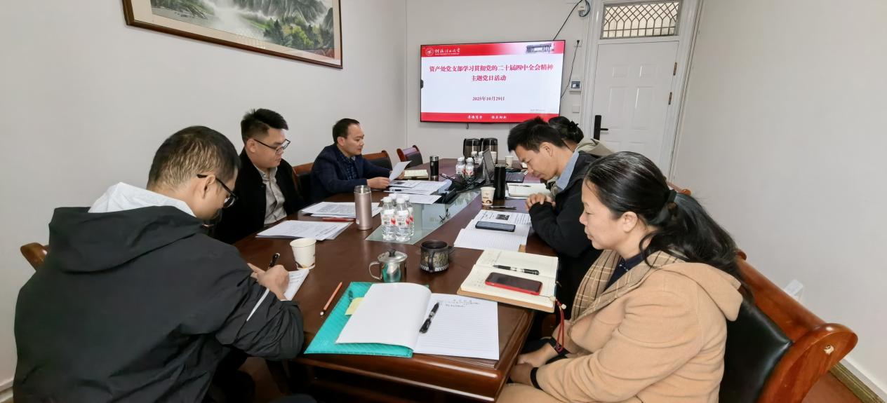 10月29日,资产管理处党支部在屏风校区后勤楼301会议室举行主题党日活动。活动由党支部书记农庆能同志主持,全体党员参加。